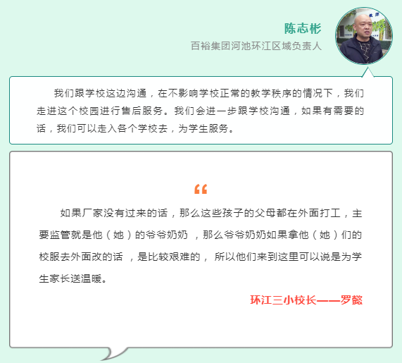 11月22日,在環(huán)江毛南族自治縣第三小學(xué)的校園內(nèi),到處是孩子們爽朗的笑聲和濃濃的愛意,百裕集團(tuán)環(huán)江裕美扶貧車間的“針心針意”售后服務(wù)走進(jìn)校園,為孩子們送來(lái)了便利。