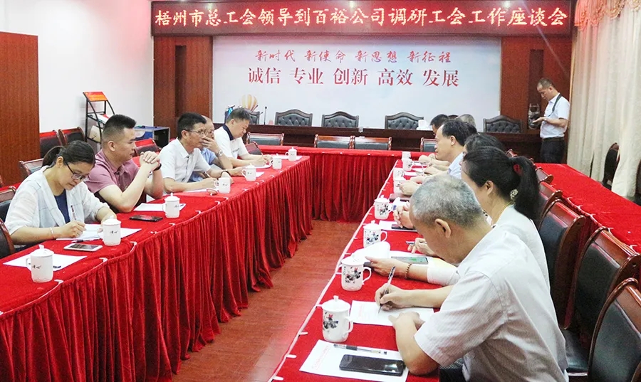 5月18日,梧州市總工會黨組書記、常務(wù)副主席謝善高、辦公室主任陳潔萍、勞經(jīng)部部長呂星等領(lǐng)導(dǎo)蒞臨百裕調(diào)研指導(dǎo),重點(diǎn)了解基層工會建設(shè)情況、運(yùn)轉(zhuǎn)情況以及勞模創(chuàng)新工作等方面的工作情況。岑溪市人大副主任、工會主席謝梅、百裕世紀(jì)工會主席曾晏來陪同調(diào)研。