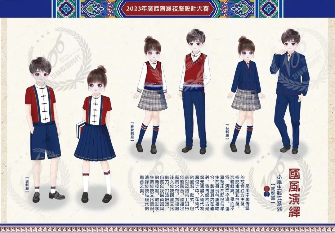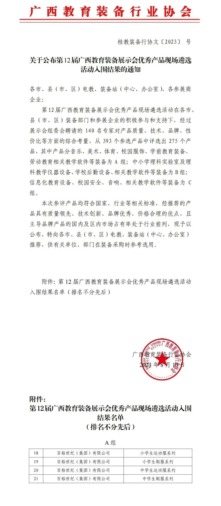百裕世紀(集團)有限公司的4個校園服飾作品成功入選第12屆廣西教育裝備展示會優(yōu)秀產品推薦目錄,分別是小學生運動服系列、小學生制服系列、中學生運動服系列、中學生制服系列。