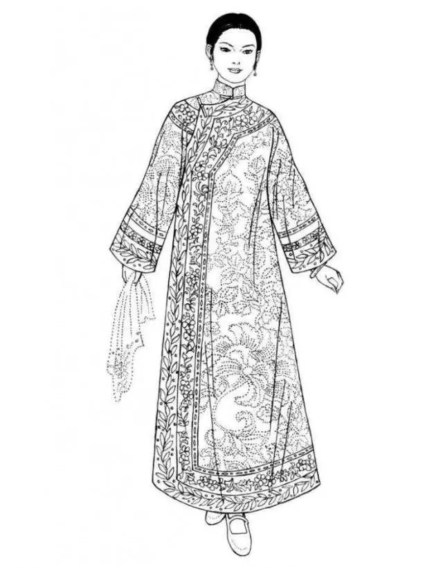 清朝后期,旗女(滿洲女子)所穿的長袍,衣身較為寬博,造型線條平直硬朗,衣長至腳踝?!霸獙氼I(lǐng)”用得十分普遍,領(lǐng)高蓋住腮碰到耳,袍身上多繡以各色花紋,領(lǐng)、袖、襟、裾都有多重寬闊的滾邊。同治年間,鑲、滾技藝達到高峰時期,有的甚至整件袍服全用刺繡、花邊鑲滾,幾乎難以辨認原本的衣料。旗女袍服的裝飾繁瑣至登峰造極的程度,從另一個方面也凸顯了強權(quán)霸主的欲望。